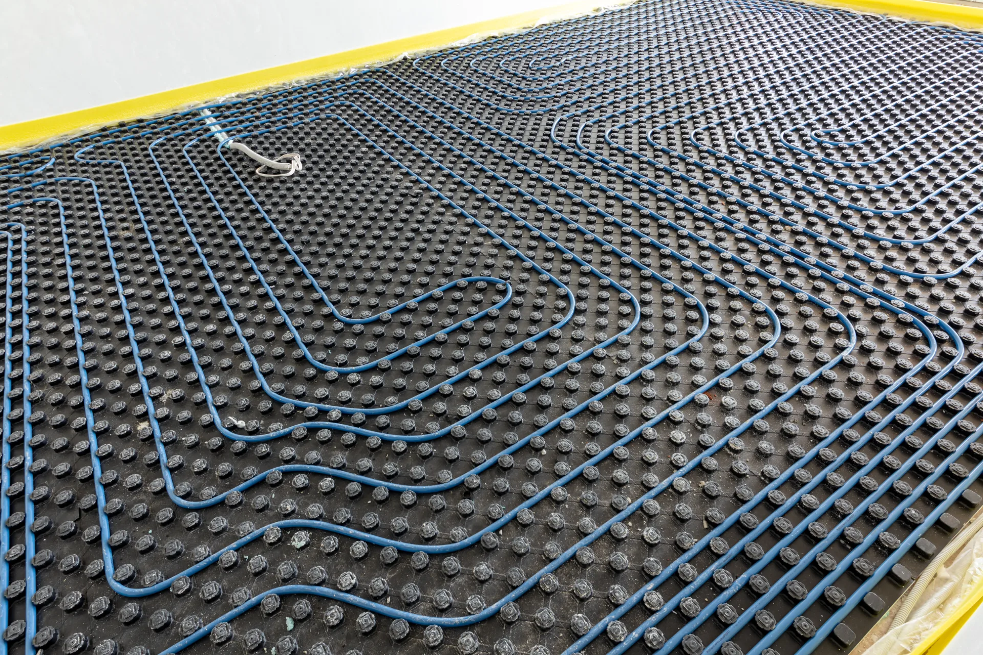 Underfloor heating with a two-layer junction plate. The bottom layer consists of a rigid expanded polystyrene.